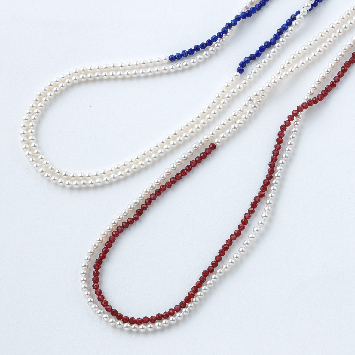 Bandiera francia フランス国旗のカラーを使ったロングネックレスは、シンプルな装いに軽やかさをプラスします。 ¥79,200 素材 淡水ケシパール/ガーネット(120cm) 淡水ケシパール/ラピスラズリ(120cm) 表示価格は税込価格となります。