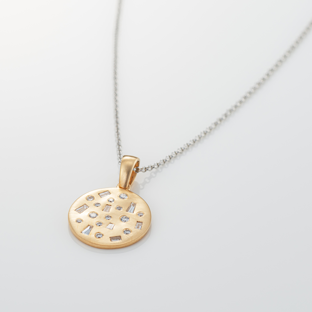 Lucernario 天窓とネーミングされたコレクションは、イレギュラーにカットされたダイヤをじかにゴールドに埋め込んだかのようなユニセックスジュエリー。マリッジリング&ネックレスでの新しい提案です。 ¥286,000 素材 K18YG/PT/ダイヤ 表示価格は税込価格となります。