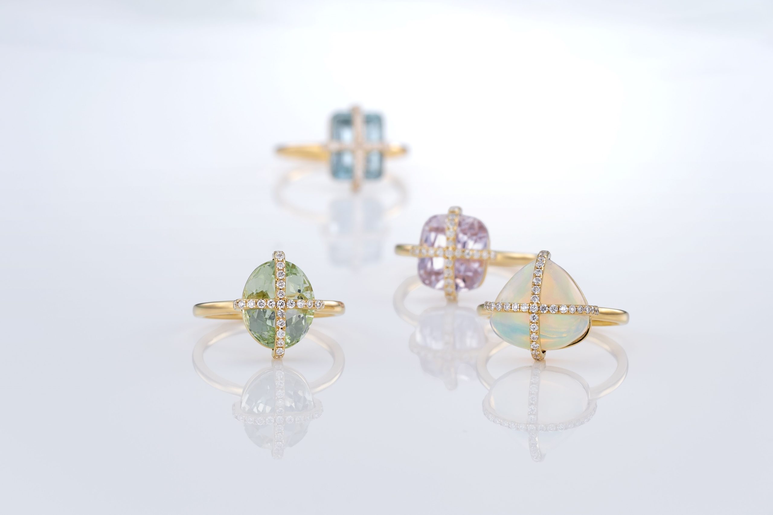 Scatola di regalo イタリア語でギフトボックスと命名されたリングは、透明感のある天然石の上を クロスするダイヤのパヴェが印象的です。 ¥330,000(sold out) 素材 K18YG/アクアマリン(3.07ct)/ダイヤモンド(0.14ct) 表示価格は税込価格となります。