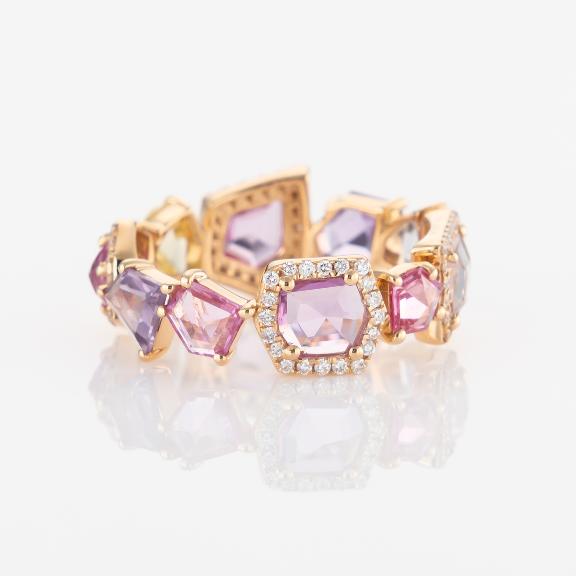 Caleidoscopio dia 万華鏡からインスパイアされたコレクションは、サファイアという貴石を大胆にカットし、大きさやカラーが異なる石を組み合わさることで美しい色の調和が生まれる“華やぎ”のジュエリー達です。 ¥418,000 素材 K18YG/カラーサファイア(3.49ct)/ダイヤ(0.3ct) #14.5 表示価格は税込価格となります。